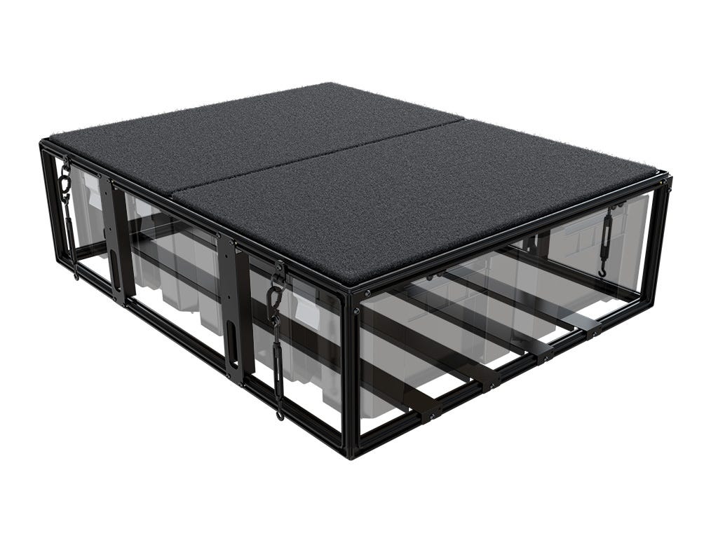 Met deze handige smalle opbergoplossing kun je 4 Wolf Pack Pro-boxen slim en in stijl opbergen in je voertuig. Hij is ontworpen voor gebruik in het interieur van een voertuig of op de overdekte laadvloer van een pick-up en is in slechts enkele minuten geïnstalleerd, waarna je de opbergboxen er gemakkelijk in en uit kunt schuiven. Het dek met tapijt kan tot 80 kg dragen en is perfect voor koel/vrachtwagens.
