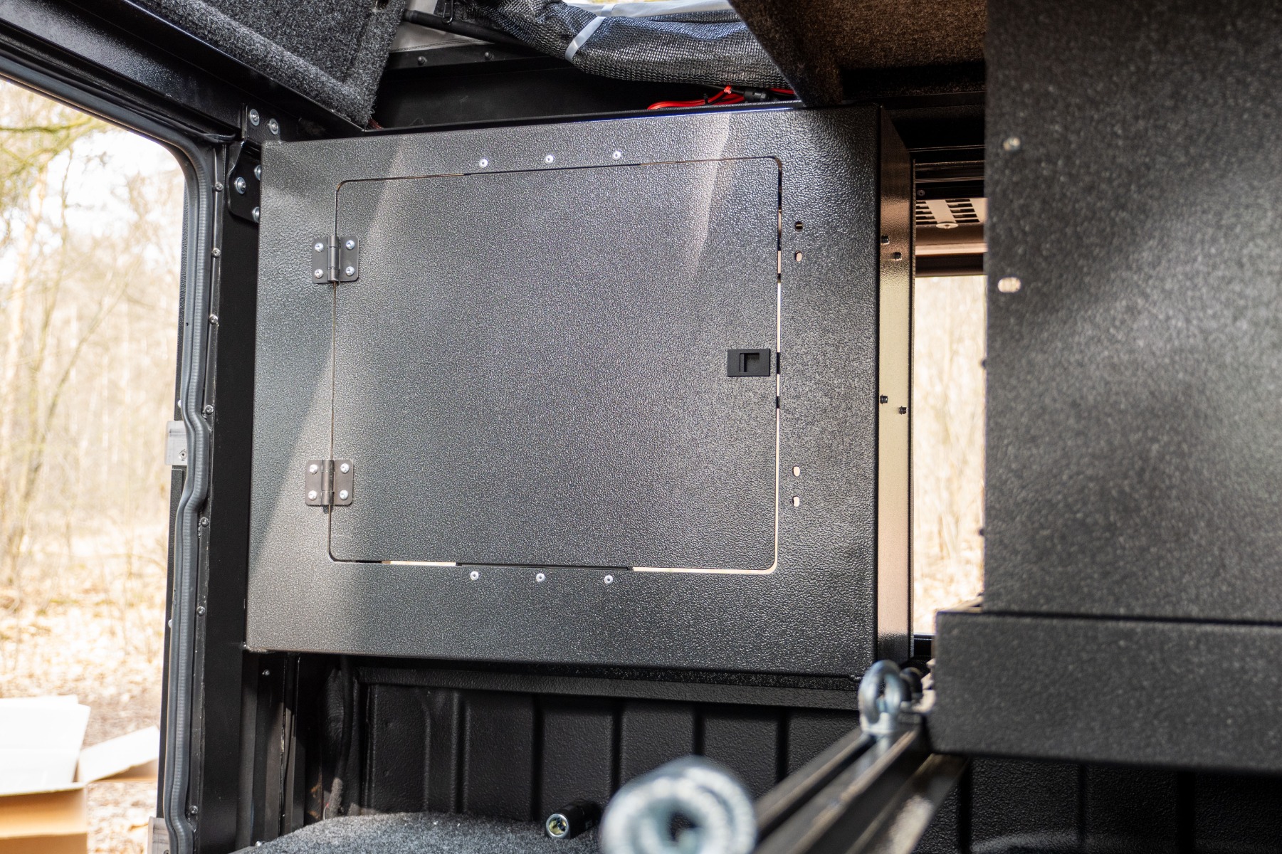 Het Bushtech Bush Cabin Zijvak is een veelzijdig opbergvak ontworpen voor de Bushtech Bush Cabin. Het kan eenvoudig worden gemonteerd in de sponning van de linker- of rechterzijdeur van de Bushtech Bush Cabin, waardoor het een handige en toegankelijke opbergruimte biedt voor al uw kampeerbenodigdheden. Dit kastje is uitgerust met twee planken, ideaal voor het opbergen van kookgerei, servies, etenswaren of andere kleine spullen. De binnenkant is voorzien van een deur waarmee de inhoud ook van binnenuit toegankelijk is, zodat u gemakkelijk spullen kunt pakken zonder naar buiten te hoeven stappen. De scharnieren zijn omkeerbaar, zodat het kastje zowel aan de linker- als rechterzijde van de cabine gebruikt kan worden, wat flexibele installatieopties biedt. De binnenkant is afgewerkt met tapijt, waardoor het kastje een nette uitstraling heeft en het geluid van rammelende spullen tijdens het rijden wordt verminderd. Het zijvak is vervaardigd uit zwart gepoedercoat aluminium waardoor het zowel licht van gewicht als duurzaam is. Kortom, een onmisbare accessoire voor uw Bush Cabin.