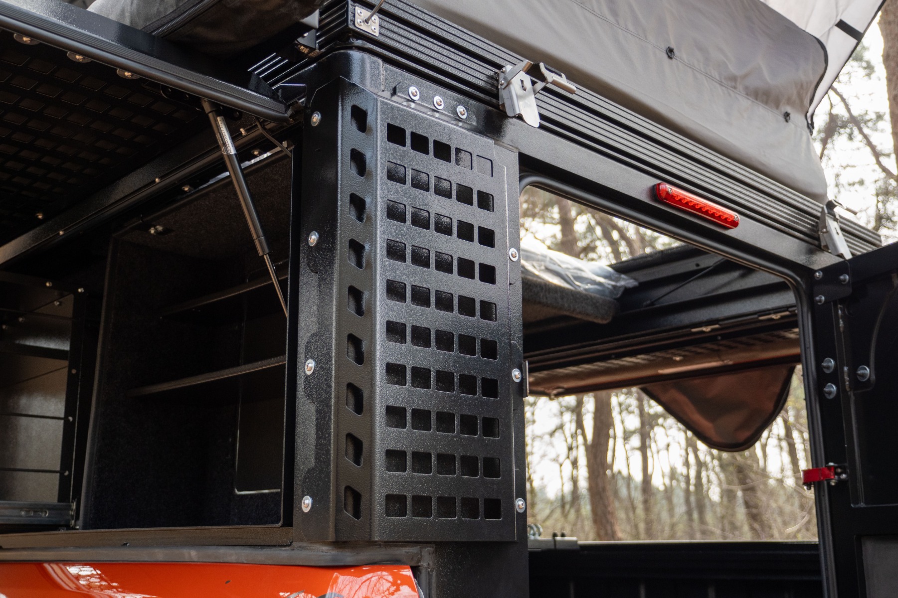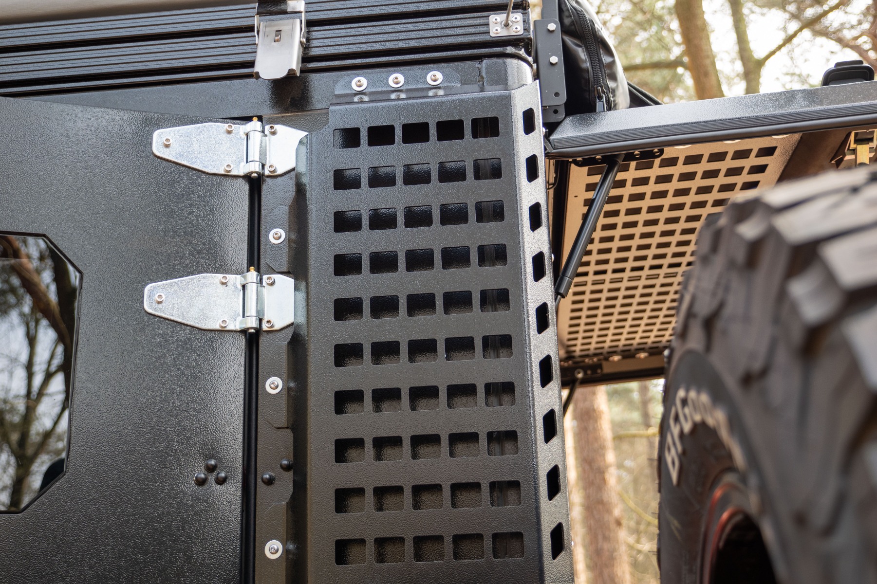 De Bushtech Bush Cabin Molly Panels Achterhoeken combineren robuuste functionaliteit met doordacht design. Ze zijn gebouwd om de uitdagingen van offroad-avonturen aan te kunnen en bieden uitzonderlijke veelzijdigheid voor het bevestigen van uiteenlopende uitrusting, zoals recovery tools, opbergtassen, gereedschap of andere outdoorbenodigdheden. Naast hun montagemogelijkheden bieden de panelen ook duurzame hoekbescherming, waardoor de achterzijden van je Bush Cabin worden beschermd tegen stoten tijdens het rijden over ruw terrein.