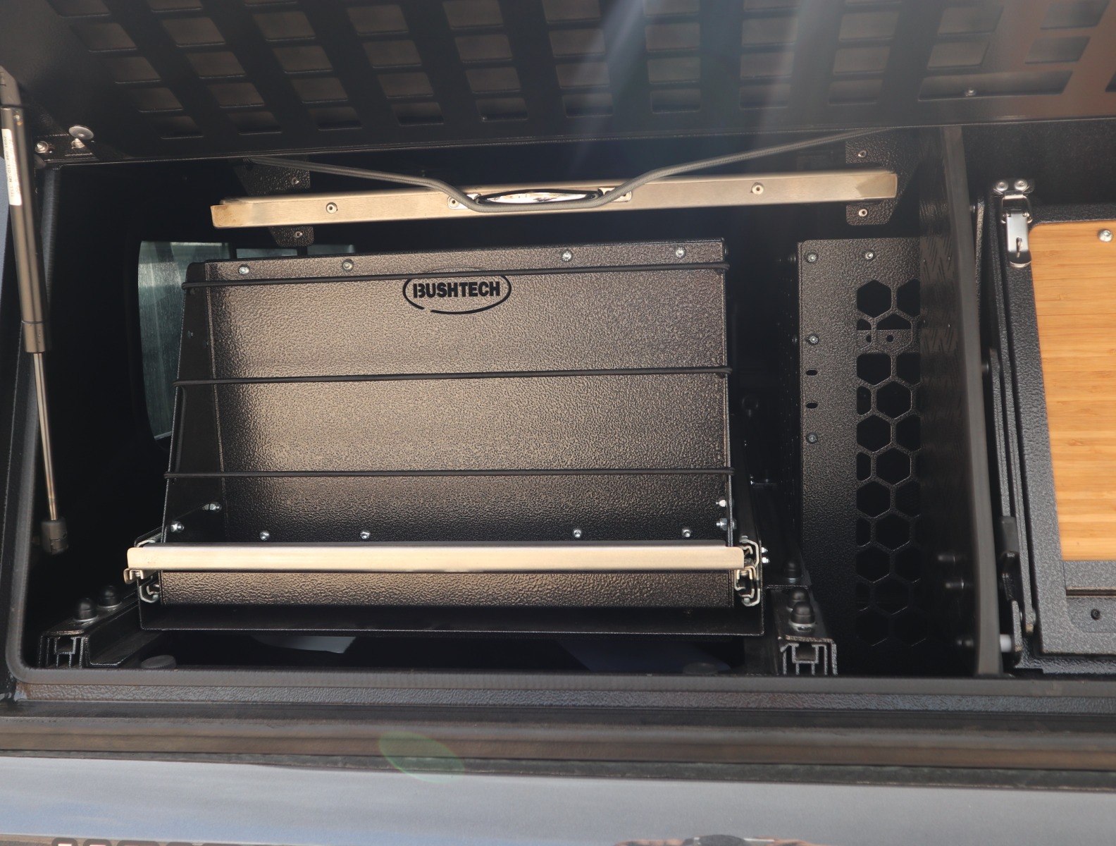 De Bushtech Canopy Pantry kan worden gemonteerd op de Bushtech Ammobox-houder en biedt een handige en ruimtebesparende opbergoplossing. Dankzij telescopische geleiders met kogellagers schuift de pantry eenvoudig uit via de zijdeur, waardoor er van buiten de canopy gemakkelijk toegang is. De uit sterk en lichtgewicht gepoedercoat aluminium vervaardigde Pantry is ideaal voor het opbergen van kookgerei, keukengerei en voedselvoorraad. Diverse elastieken voorkomen dat spullen tijdens het rijden uit de kast vallen, wat het tot een praktische aanvulling op uw Bushtech Canopy maakt.