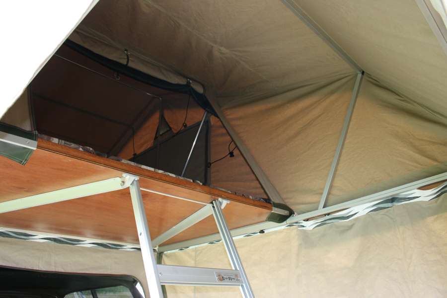 Deze daktent is in enkele minuten op te zetten. Verwijder simpelweg de beschermhoes, klap de ladder uit en gebruik deze om de tent uit te vouwen. Schuif het aluminium frame uit om de tent te verlengen en ruimte te creëren voor de overdekte ingang en de ondertent. Stel de ladder af op de juiste hoogte en gebruik de meegeleverde stokken om het flysheet te spannen, en de tent is klaar om in te slapen. Indien gewenst kan de ondertent bevestigd worden, om meer beschutting en privicy te creëren.