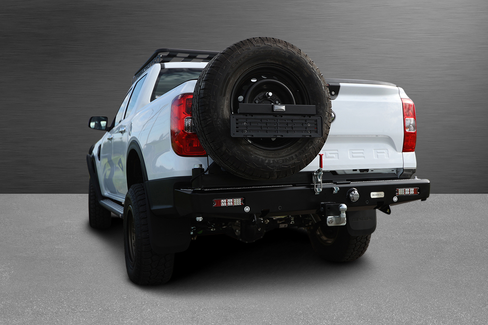 De achterbumper voor de Ford Ranger (2023-heden) bevat twee montagebeugels die direct aan het chassis verbonden worden, dit zorgt voor een enorme stevigheid. De bumper is voorzien van Hi-Lift Jack punten en is aan beide kanten voorzien van geïntegreerde scharnierpunten om de optioneel verkrijgbare scharnierende beugels te monteren. Deze onverwoestbare beugels zijn niet inbegrepen en los verkrijgbaar voor reservewielen, jerrycan houders en opslagboxen.