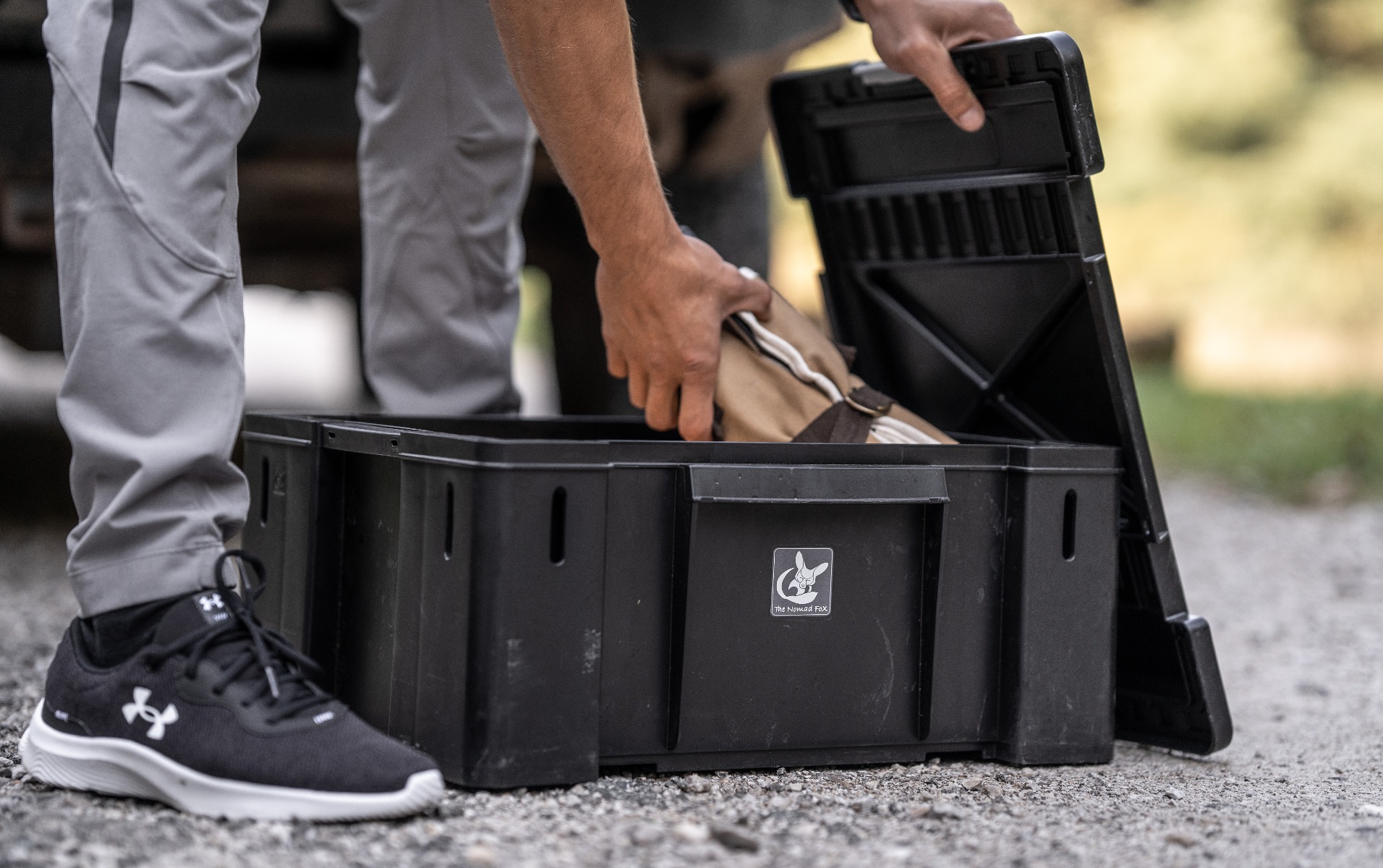 De Nomad Box heeft een grote stapelbaarheid, met een goed slot tussen de dozen. Rechte zijkanten voor maximale opslagruimte en verticale belastingoverdracht. Dubbelwandige versterkte hoeken voor maximale stevigheid bij het stapelen van zware ladingen, en de perfecte maat voor het inpakken van uw uitrusting in uw voertuig.