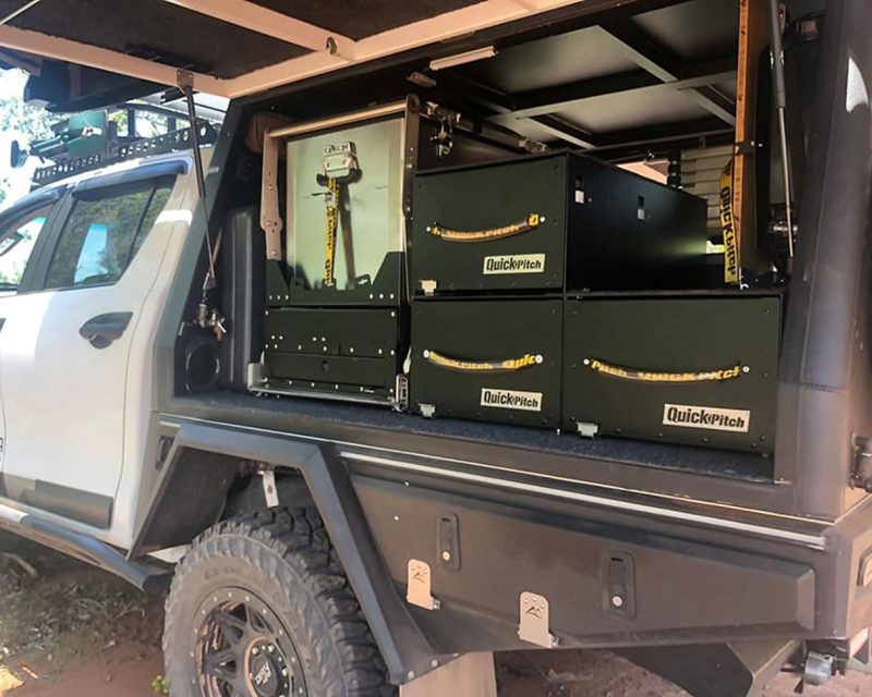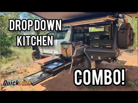 De Quick Pitch Drop Down Keuken Combi, ontwikkeld in Zuid-Afrika, is de perfecte oplossing speciaal voor overlanders met een vlakke tray op hun pickup. Dit innovatieve product combineert een Drop Down Fridge Slide met een Mini keuken en biedt een compacte en veelzijdige opstelling voor je avonturen tijdens het overlanden.