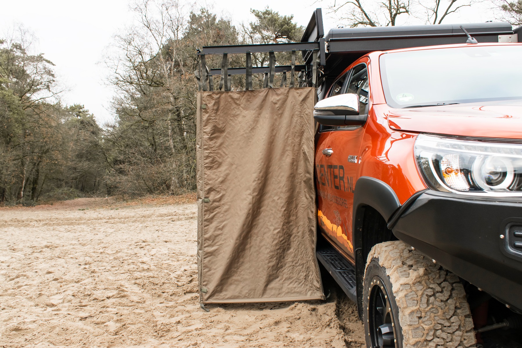 Aangezien niet alle voertuigen dezelfde hoogte hebben en Quick Pitch privacy wil bieden aan zowel grote als kleine gebruikers, hebben ze het douchegordijn voorzien van verstelbare riempjes. Hiermee kunt u ook gemakkelijk de hoogte aanpassen in geval van gebruik voor verschillende doeleinden.