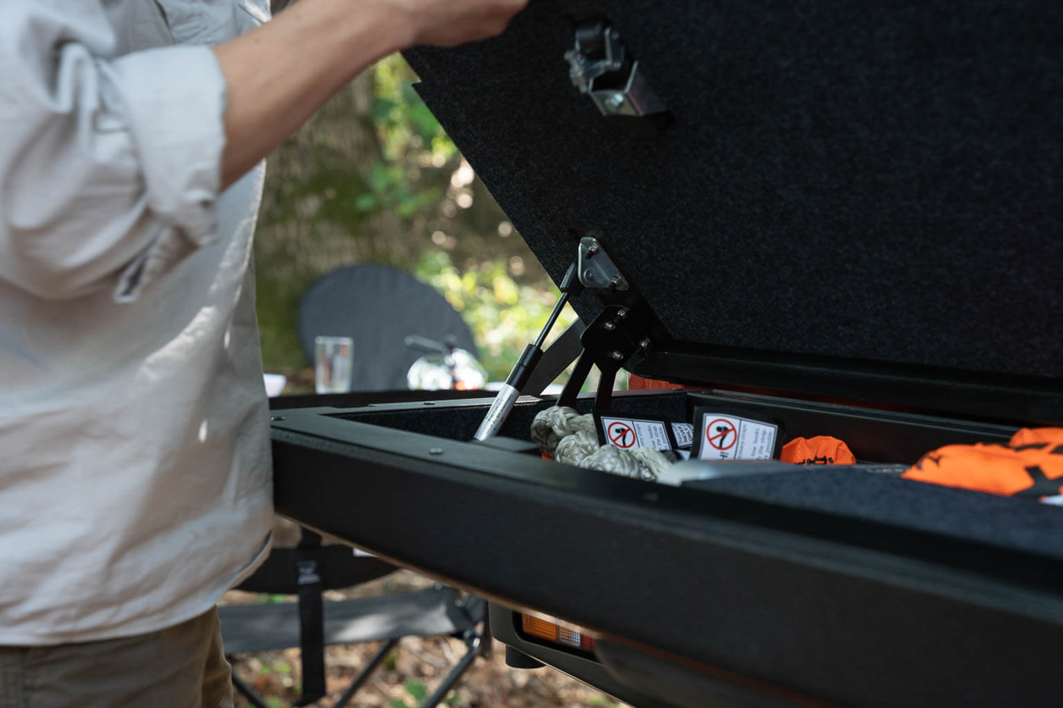 Maak gebruik van de ruimte in uw achterklep die anders verloren zou gaan met deze Achterklep Opslag Mod van Huracan Fabrication. Gemaakt van laser gesneden staal om stevig bevestigd te worden in uw achterklep. U kunt de extra ruimte bijvoorbeeld gebruiken voor recovery gereedschap of reserve onderdelen.