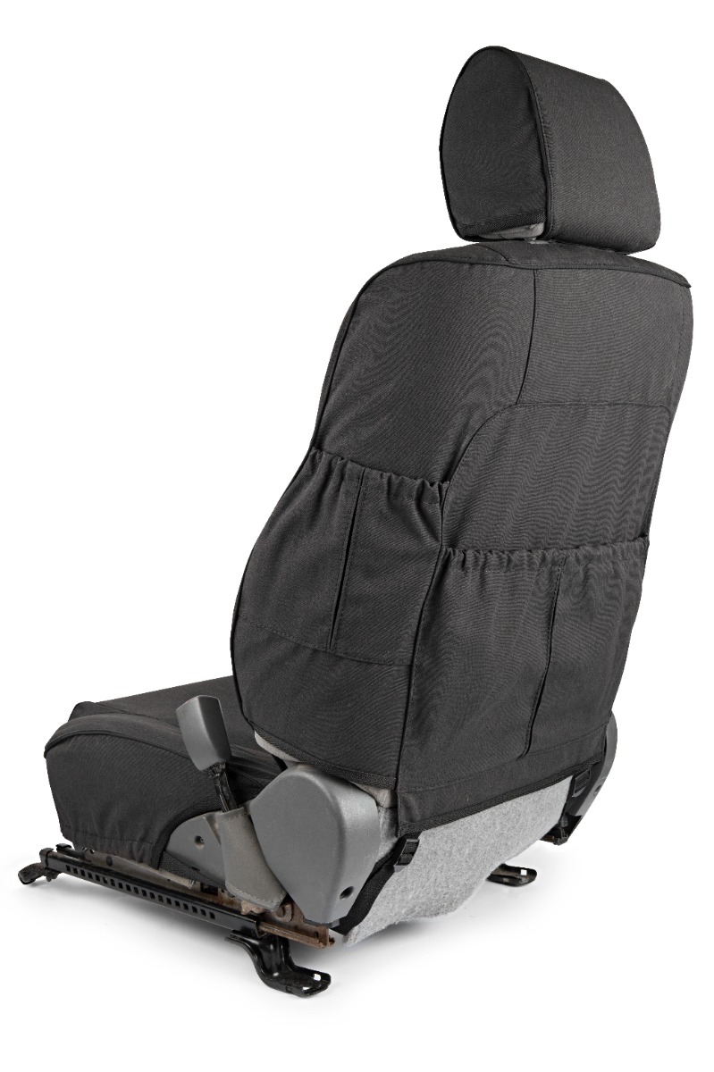De set bevat hoezen voor de voorstoelen inclusief hoofdsteunen en middenconsole, en is voorzien van verschillende opbergzakjes.